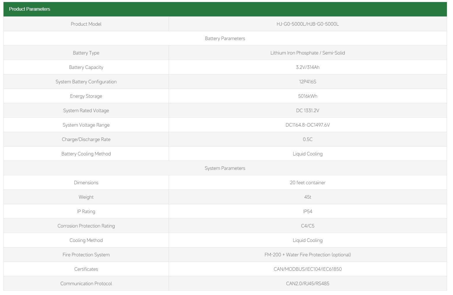 HJ-G0-5000L Energy Storage Container System is a reliable and efficient energy storage solution that integrates high-performance battery technology and precise liquid cooling system. It is designed to meet the needs of large-scale energy storage and is widely used in energy storage, power grid peak shifting and frequency regulation, renewable energy access and other fields.